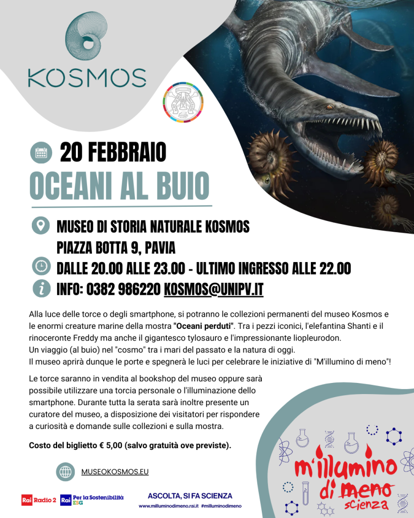 Venerdì 20 febbraio, tra le iniziative dell’Ateneo rientra anche Oceani al buio!, l’apertura serale speciale proposta da Kosmos – Museo di Storia Naturale dell’Università di Pavia, che invita il pubblico a visitare il Museo con le luci spente, utilizzando torce o smartphone, per vivere le collezioni in modo nuovo, lento e consapevole.